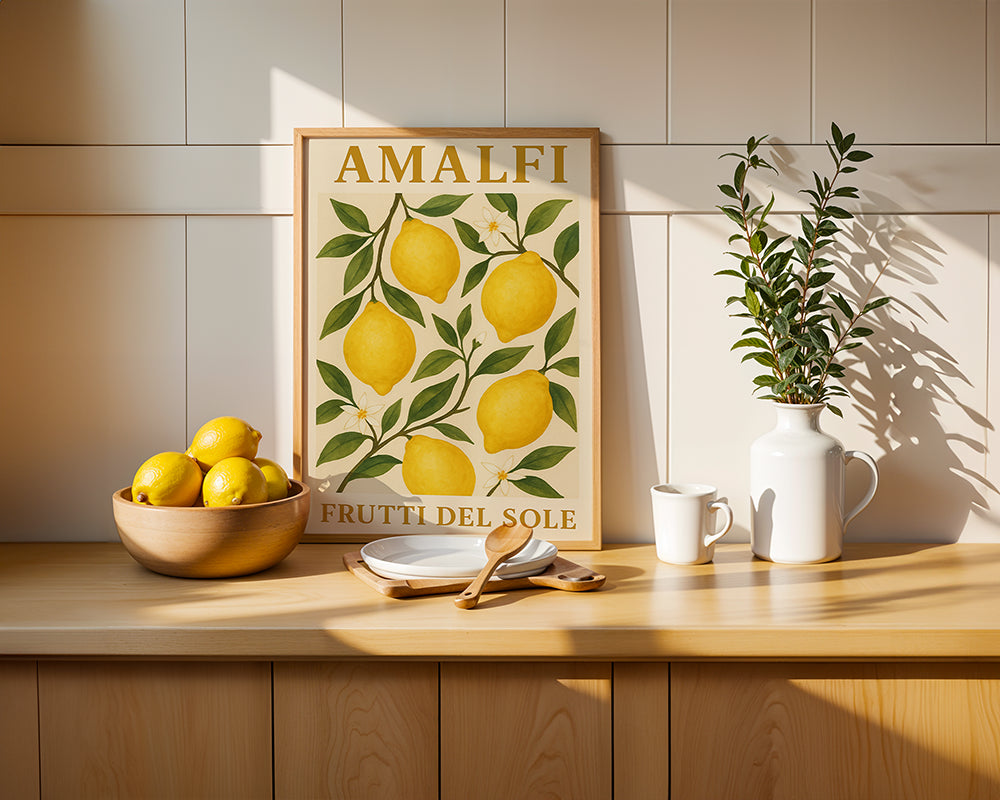 Ein charmantes Poster im mediterranen Stil, das saftige, sonnengelbe Zitronen mit satten grünen Blättern und zarten weißen Blüten zeigt. Der Schriftzug „Amalfi – Frutti del Sole“ erinnert an die malerische Küstenregion Italiens, in der die Zitrusfrüchte unter strahlender Sonne gedeihen. Perfekt, um sommerliche Frische und italienisches Lebensgefühl in jedes Zuhause zu bringen.