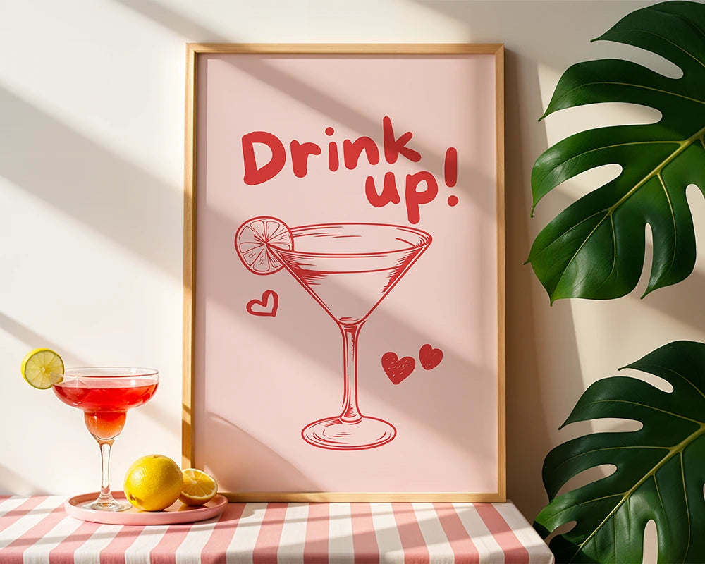 Das Poster Drink Up! bringt Spaß, Farbe und gute Laune an jede Wand! Mit seinem verspielten Design in Rot- und Rosatönen erinnert es an spritzige Cocktails und ausgelassene Sommerabende mit Freunden. Die handgezeichnete Illustration des Cocktailglases kombiniert mit liebevollen Herz-Details macht dieses Motiv zu einem echten Hingucker in Küche, Barbereich oder Wohnzimmer. Perfekt für alle, die das Leben mit einem Lächeln genießen – Cheers! 🥂
